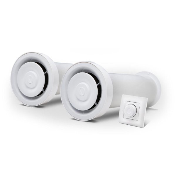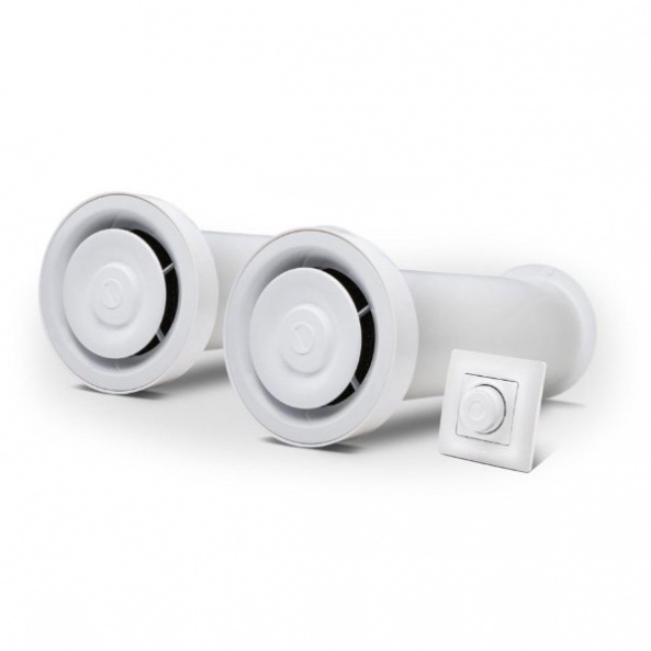 2 рекуператори Ventoxx Champion (під керування Twist), Ефективність рекуперації 74-86%, Продуктивність 17-60 м³/ч, Споживана потужність 1,6-4,6 Вт, Рівень шуму 16-43 дБ, 11 програм і 3 швидкості роботи, Максимальна товщина стіни для встановлення 485 мм, Робоча температура від -20°C до +50°C. Труба довжиною 500 мм, діаметром 150 мм.