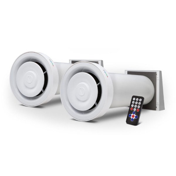 2 рекуператори Ventoxx Champion з зовнішніми кришками - система вентиляції з приточно-витяжною функцією. Ефективність повернення тепла (рекуперації) 86%. Продуктивність 60 м³/ч. Споживана потужність 4.6 Вт, рівень шуму 43 дБ. 11 програм і 3 швидкості роботи. Максимальна товщина стіни для установки – 485 мм.