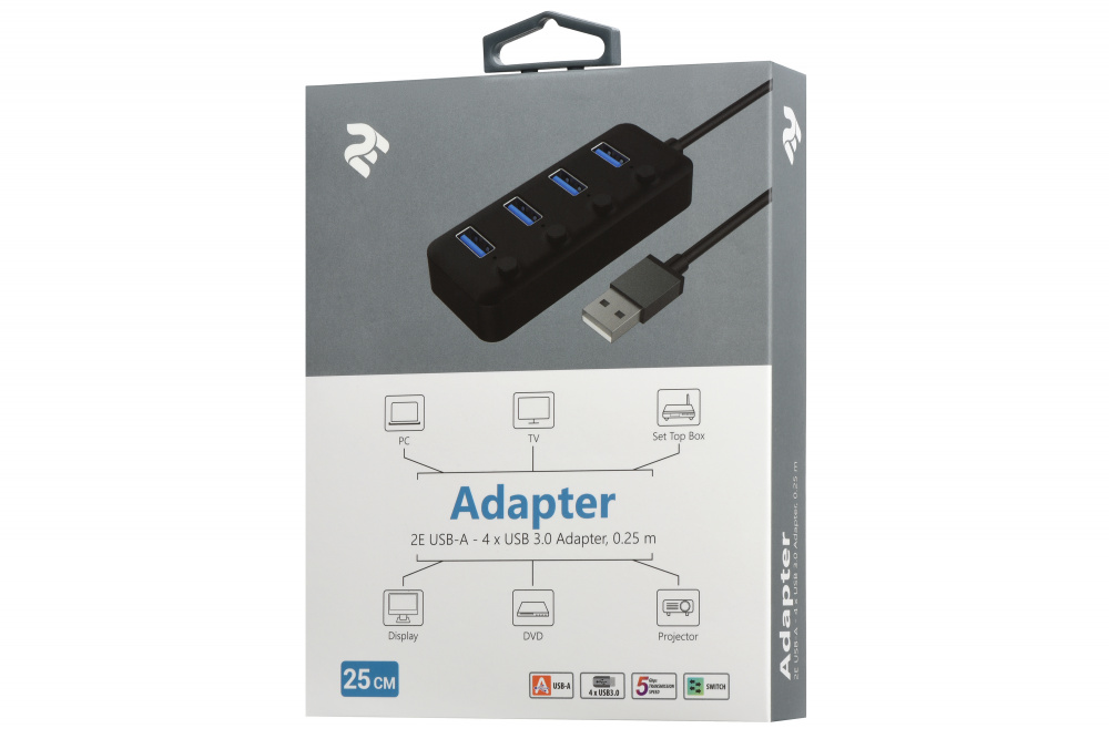 Опис товару Адаптер 2Е USB-A - 4*USB3.0, Hub with switch, 0.25m