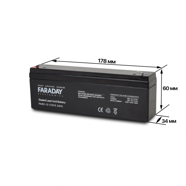 FAR2-12 - герметичний свинцево-кислотний акумулятор. Напруга: 12 В. Номінальна ємність (25°С): 2 А/г. Габаритні розміри: довжина - 178 мм, ширина - 34 мм, висота - 60 мм. Вага: 0.9 кг