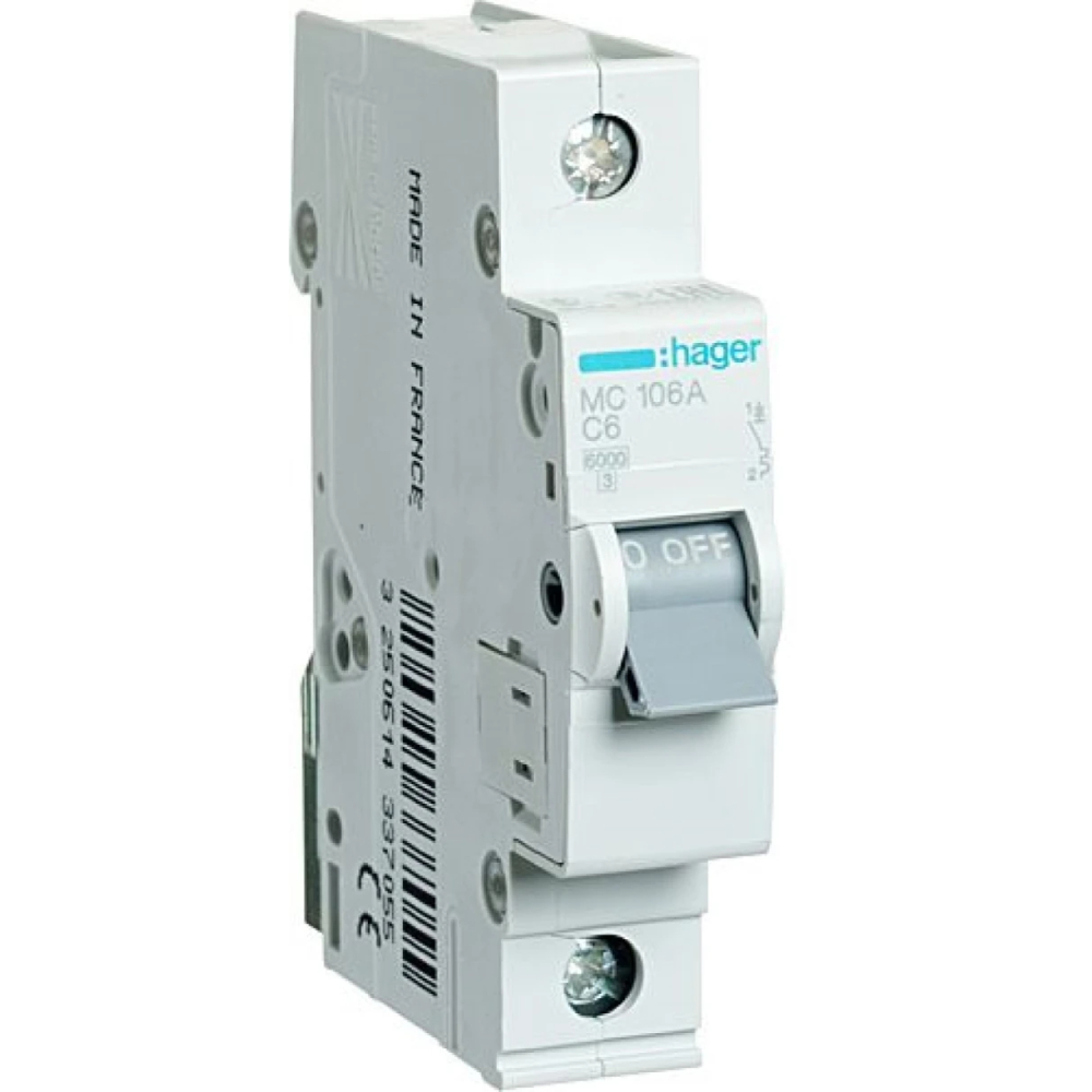 Автоматичний вимикач Hager MC106A 6А, 1п, С, 6 кА встановлюється в електричних щитах на стандартну напрямну DIN-рейку і може використовуватися як для побутових, так і для промислових цілей. Він швидко реагує на перевантаження і короткі замикання, автоматично вимикаючи електричний ланцюг для запобігання загоряння і пошкодження обладнання. Він також може працювати як вимикач для ланцюгів навантаження.