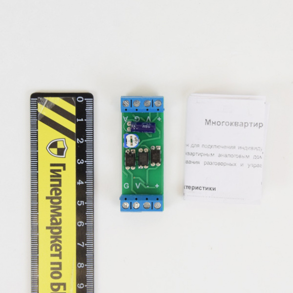 Багатоквартирний адаптер дозволяє підключити індивідуальний відеодомофон до багатоквартирного під'їздного домофона. Дає можливість з одного домофона контролювати і загальні під'їзні двері, і двері в квартиру. Сумісними з багатоквартирними системами Vizit, Cyfral і індивідуальними домофонами Gardi, Commax, Kocom. Живлення від квартирного відеодомофона. Розміри: 56х21х14мм