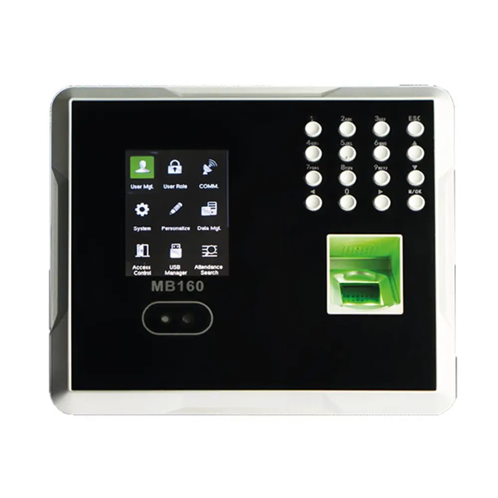MB160-ID ADMS - біометричний термінал з функціями розпізнавання користувача по обличчю, відбитку пальця, карті. Підтримує кілька методів перевірки, включаючи сканування обличчя, відбиток пальця, читання RFID карт, доступ по паролю та комбінації між ними. Перевірка відвідувача здійснюється менш як за 1 секунду. Зв'язок між MB160 із сервером здійснюється через інтерфейс Ethernet TCP/IP або USB для ручної передачі даних.