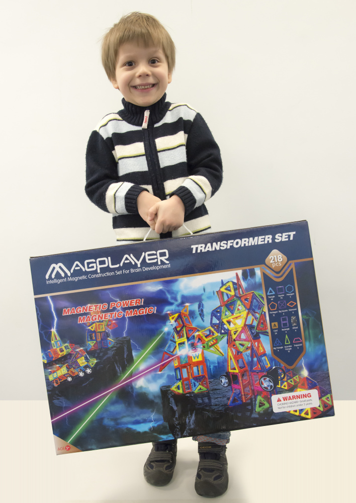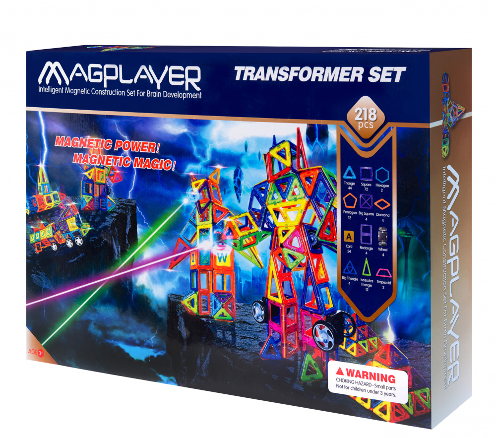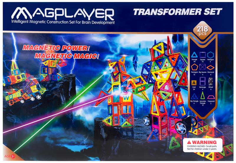 Магнітний конструктор MagPlayer з 218 деталями в наборі дозволить дитині втілити найсміливіші ідеї. Набір складається з деталей різної форми та фігур: коліс для автомобілів та карток з літерами і математичними знаками. Гра з конструктором MagPlayer всесторонньо розвиває інтелект дитини, оскільки задіює одночасно дві півкулі мозку. Іграшка розвиває просторову уяву, креативність, логіко-математичне мислення і моторику рук. Елементи конструктора MagPlayer містять магніт, який не потребує дотримання полярності для з’єднання. Тому діти легко та швидко складатимуть фігури. В набір входять схеми складання різних фігур.