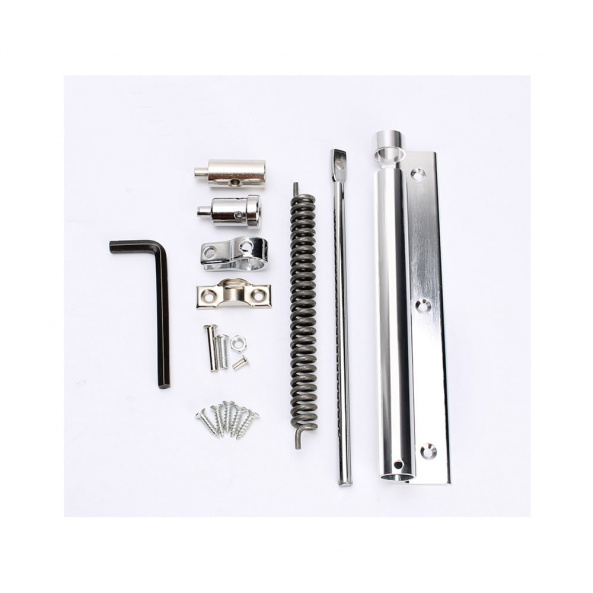 Дотягувач із пружинною тягою встановлюється в середній частині дверної коробки або дверного полотна. Довжина важеля: 200 мм. Зусилля закривання (вага дверей до 50 кг, ширина 600-800 мм). Регулювання швидкості та сили закриття. Розміри: 190 х 60 мм. Колір білий.