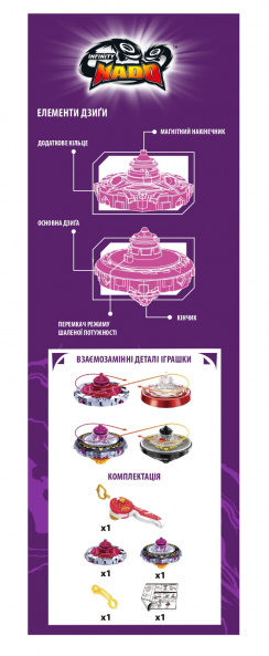 Відкрийте для себе нові складаються дзиги Infinity Nado! За допомогою магнітного лаунчера підсильте спіннер, перш ніж запустити його на арену. Щоб увійти в режим атаки, додайте додаткове кільце на дзигу: за допомогою магнітного лаунчера, щоб встановити кільце на спіннер під час бою на арені, щоб підвищити потужність і швидкість. Коли ваш спіннер сповільниться, ви можете посилити його під час бою на арені і додати велику швидкість! Спробуйте нову стратегію, складаючи нові кільця (продаються окремо) на спіннері, щоб збільшити їх силу проти вашого супротивника. Набір складається з магнітного лаунчера, металевої підстави, що обертається, металевого кільця, яке можна додати під час бою, і інструменту для зборки.