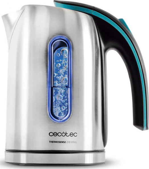 Електрочайник CECOTEC ThermoSense 270 Steel нагріває до 8 склянок по 200 мл одночасно. Чайник ThermoSense з місткістю 1,7 л і потужністю 2200 Вт заощадить ваш час і допоможе швидше насолодитися улюбленими напоями. Корпус виконаний з високоякісної нержавіючої сталі 18/10, індикатор рівня води - з харчового пластика, BPA, що не містить, і інших токсичних речовин.