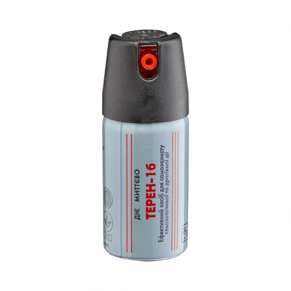 Газовий балончик аерозольного типу Терен-1Б призначений для смозахисту у разі виникнення небезпеки нападу. Препарат впливає "конусом" аерозольної хмари. Містить речовини сльозогінної та дратівливої дії (ірритант) - морфолід пеларгонової кислоти. Дана речовина викликає сильну сльозотечу, подразнення слизових оболонок очей і носоглотки.