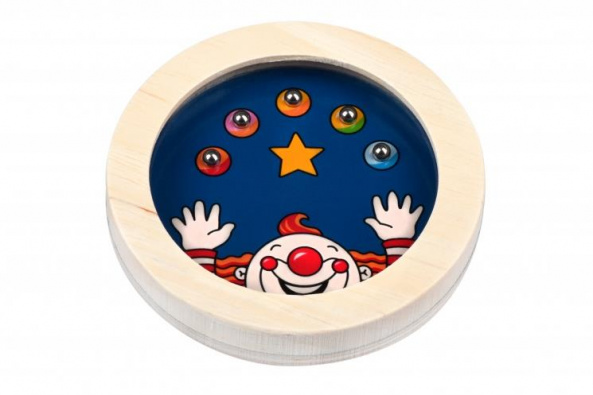 Веселий клоун-жонглер спонукатиме до захопливої гри у лабіринт. Німецький бренд goki пропонує розвиваючу гру-лабіринт «Клоун». П’ять маленьких металевих кульок швидко ковзають по поверхні і чекають доки ти закотиш їх у лунки. Щоб досягти мети, дитині необхідно зосередитись і проявити уважність та точність. Іграшка вироблена із натуральної і якісно обробленої деревини. Яскраве зображення нанесене безпечними фарбами на водній основі. На малюнку зображений клоун, що жонглює п’ятьма кольоровими кульками. Діаметр основи – 8см. Рекомендовано дітям від 5 років.
