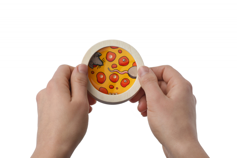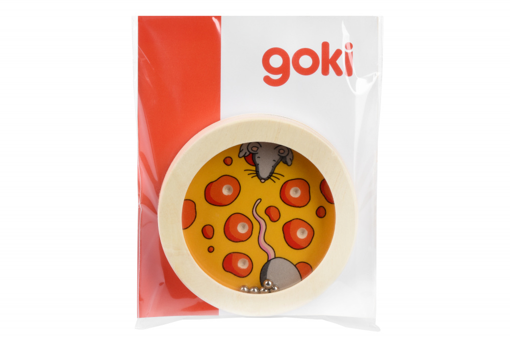 Розвиваюча гра-лабіринт «Мишка» на розвиток посидючості, дрібної моторики та уважності від німецького бренду goki. Мета - зловити усі металеві кульки в п'ять лунок. Зробити це не так легко, як може здатись: кульки спритно катаються по поверхні, але якщо зосередитись на грі, обов’язково переможеш! На малюнку зображена кумедна мишка в оточенні улюблених шматочків сиру. Іграшка вироблена із натурального дерева, воно якісно оброблене і вкрите фарбами на водній основі. Діаметр гри – 8 см. Рекомендовано дітям від 5 років.