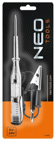 Тестер напруги бортової мережі автомобіля NEO в діапазоні 6-24 В, зі світловим індикатором. Дозволяє виявляти струм в електричних ланцюгах мотоциклів, легкових та вантажних автомобілів. Являє собою ідеальне доповнення комплекту інструментів кожного водія, що нагодиться в кожній майстерні. Марка NEO відповідає очікуванням професіоналів.
