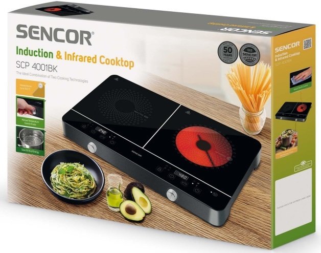 Двоконфорочна індукційна плита & інфрачервона плита. Комбінація індукційної та інфрачервоної конфорки. Просте управління з комбінацією класичного поворотного регулятора і сенсорної панелі. Простий догляд. Висока ефективність, економія часу і електроенергії при приготуванні. Склокерамічна панель індукційної конфорки холодна при доторканні, так як тепло індукційно генерується прямо в посуді (увага, панель може частково нагрітися від посуду). Індукційна технологія приготування економить час (60%) і електричну енергію (50%) Володіє високою ефективністю (до 90% ) і мінімальними втратами тепла. Гладка склокерамічна поверхня плити гарантує простоту і гігієнічність догляду.