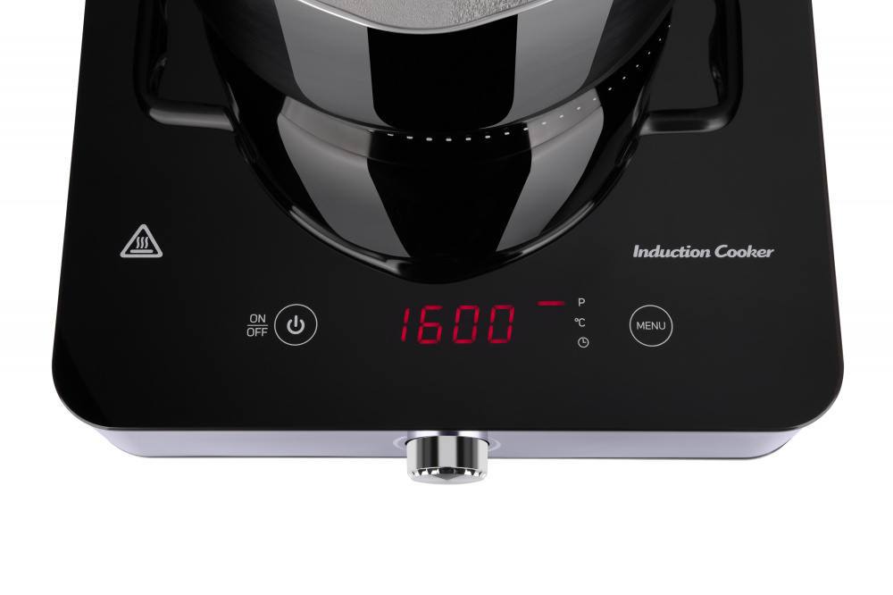 Індукційна електрична варильна поверхня на одну конфорку з потужністю 1800 Вт, комбінованим управлінням, регулюванням температури та потужності, а також таймером приготування та захистом від перегріву і перепадів напруги.
