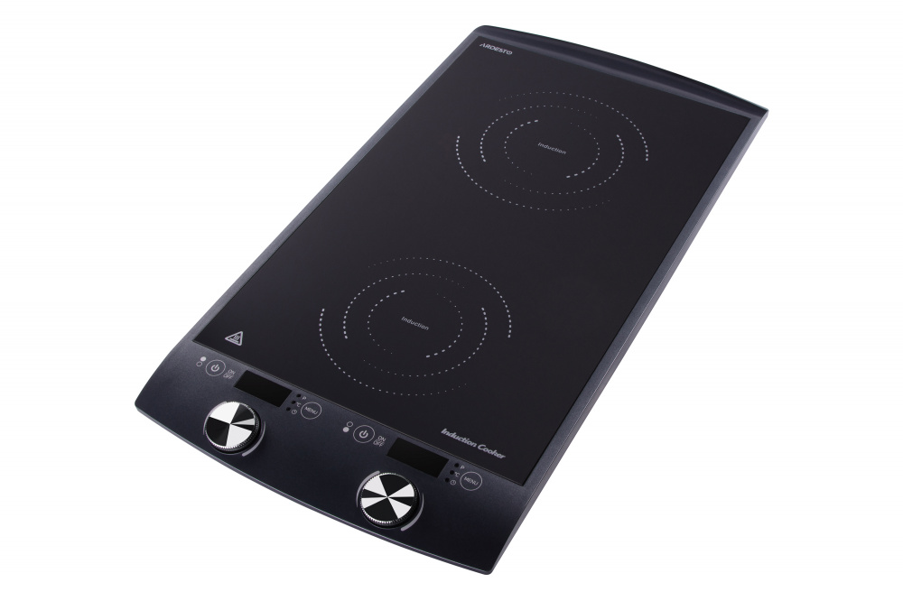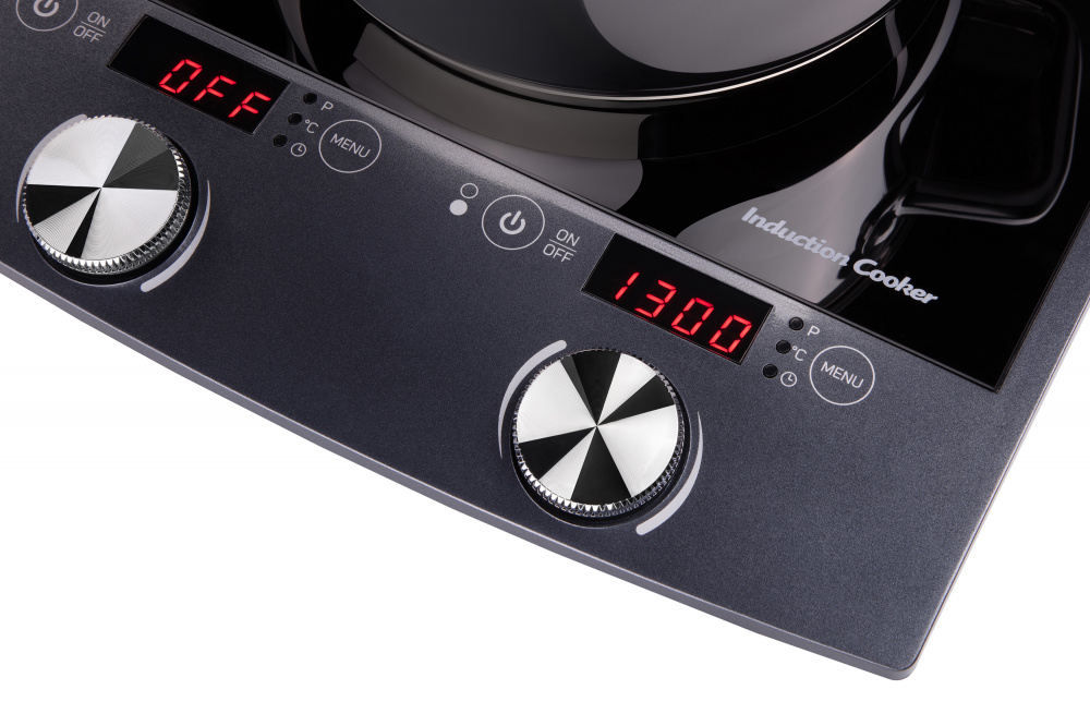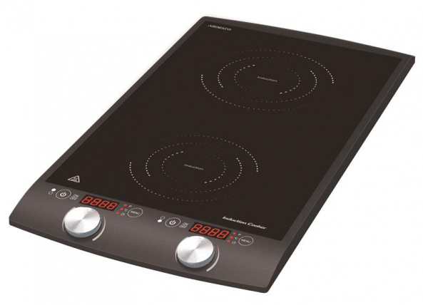 Індукційна електрична варильна поверхня на дві конфорки з загальною потужністю 2900 Вт, комбінованим управлінням, регулюванням температури та потужності, а також таймером приготування та захистом від перегріву і перепадів напруги.