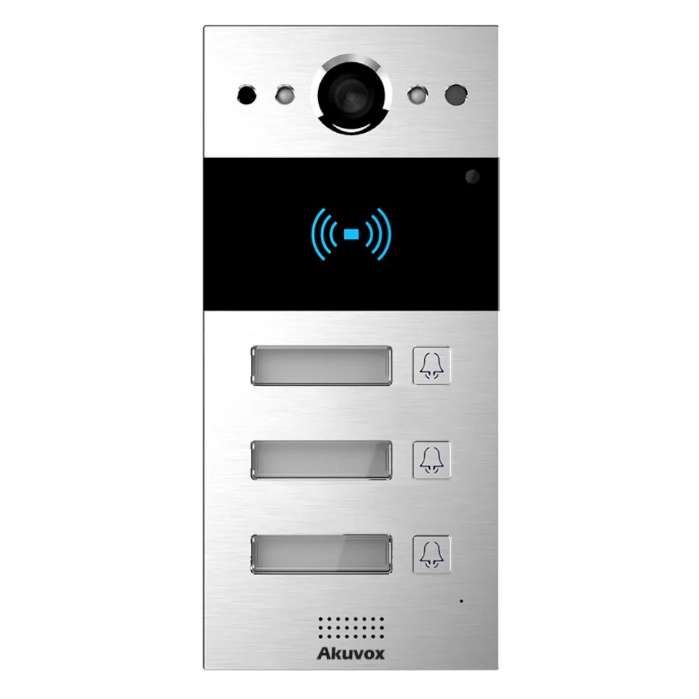 Трьохабонентна SIP панель виклику з камерою та RF-зчитувачем, 3 кнопки виклику з панелями назв, Сумісність зі стандартом SIP для легкої інтеграції з будь-якою SIP АТС, Двосторонній аудіозв’язок з функцією усунення відлуння, Камера 2МП, кути огляду: 110°(гориз.) / 58°(вертик.), Зчитувач RF-карток 13.56MHZ та 125KHZ, 2 релейні виходи для відчинення дверей, Підтримка PoE (IEEE802.3af), Матеріал корпусу: алюміній, Клас захисту IP65, Настінний монтаж
