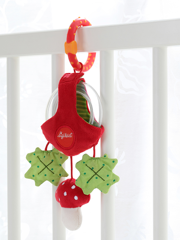Проста, але в той же час така цікава кліпса на коляску «Грибочок» від німецького бренда sigikid. Кліпсу просто зачіпити і легко зняти з коляски. Іграшка вироблена із поліестеру, м’якого і безпечного матеріалу. Пластикове кільце виконує роль брязкальця, воно знімне. У листочках схована спеціальна фольга, тому вони будуть приємно шарудіти при стисканні. Розміри іграшки: 18 x 2 x 9 см. Для дітей з народження.