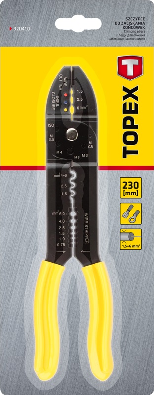 Кліщі TOPEX для обтискання ізольованих і неізольованих наконечників. Призначені для проводів діаметром 1.5-6 мм ². Ергономічні гумові рукоятки добре лягають в долоню, що підвищує комфорт роботи. Бренд TOPEX призначений для домашніх майстрів.