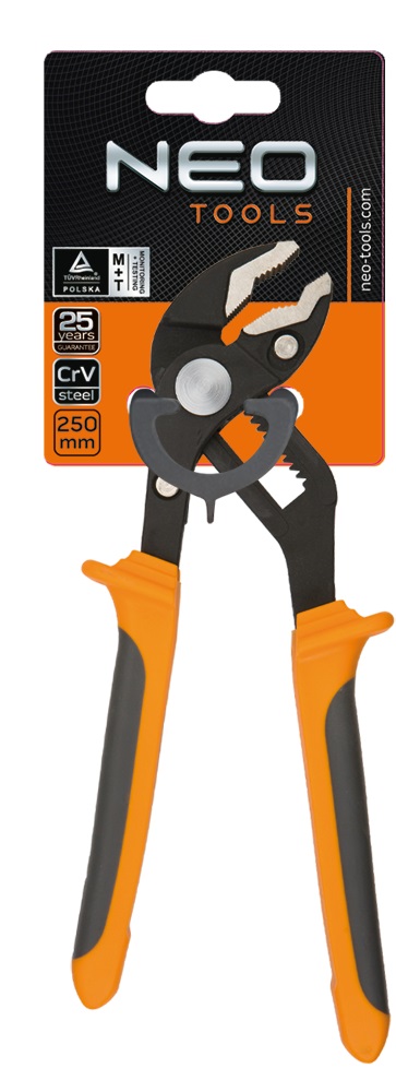 Кліщі сантехнічні NEO, розмір 250 мм, робочий діапазон губок 0-42 мм, з переставним зубчастим шарнірним механізмом. Виконання відповідно до стандарту DIN 8976. Високосортна хромованадієва сталь гарантує довголітню міцність кліщів. Двокомпонентні, ергономічні рукоятки підвищують комфорт експлуатації. Якість інструменту підтверджено сертифікатом TÜV і 25-річною гарантією виробника. Бренд NEO виправдовує очікування професіоналів.