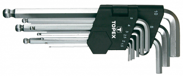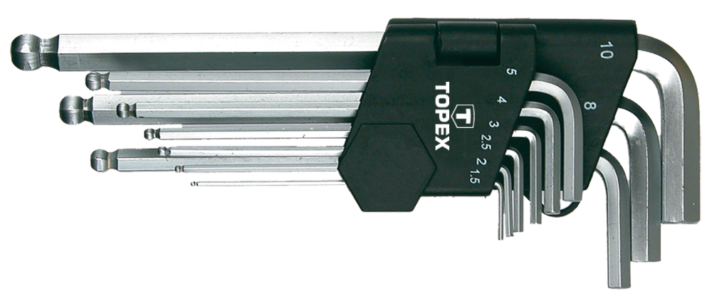 Ключі шестигранні довгі TOPEX розміри 1.5 - 10 мм, виготовлені з міцної хромомолібденової сталі, що забезпечує довгий термін служби інструменту. Кулясті наконечники з робочим кутом 30° дозволяють працювати в важкодоступних місцях. Зручна пластмасова упаковка з відділеннями для кожного ключа полегшує їх зберігання. Бренд TOPEX призначений для домашніх майстрів.