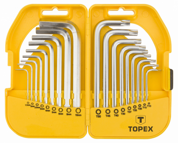 Набір коротких шестигранних ключів та ключів Torx TOPEX стане в нагоді при механічних роботах і всіх роботах, які виконуються майстрами-аматорами. Ключі виготовлені з міцної хромомолібденової сталі, що забезпечує довгий термін служби інструменту. Зручна пластмасова упаковка з відділеннями для кожного предмета полегшує їх зберігання. Бренд TOPEX призначений для домашніх майстрів.