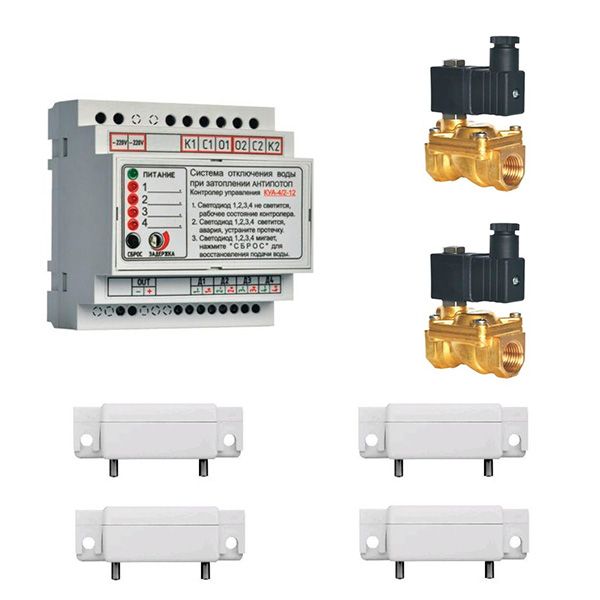 Комплект антизатоплення АНТИПОТОП - система запобігання протікання води в квартирах, заміських будинках, підприємствах. У комплекті: контролер керування ККА4/2-12*1шт.; датчик затоплення Akvarate*4шт.; клапан електромагнітний NC1/2"(нормально замкнений; Ø труби 1/2")*2шт.