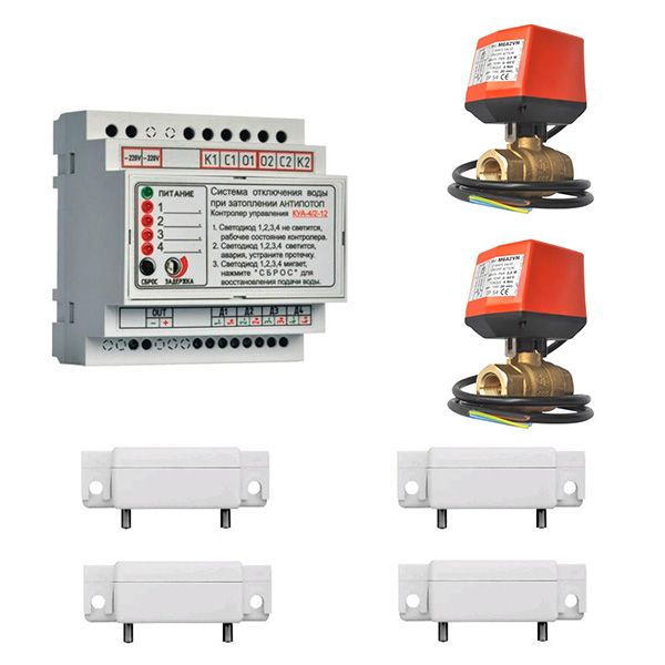Комплект антизатоплення АНТИПОТОП - система запобігання протікання води в квартирах, заміських будинках, підприємствах. У комплекті: контролер керування ККА4/2-12*1шт.; датчик затоплення Akvarate*4шт.; кран кульовий з сервоприводом 1/2"(кран кульовий Ø труби 1/2", сервопривід 220V час зачинення 25 сек.)*2шт.