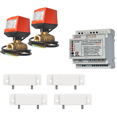 Комплект для квартири з використанням кульових кранів з електроприводами (сервомоторами): контролер керування ККА-4/4-С, 2 кульових крана з сервоприводом 632F + M6A2, 4 датчики затоплення Akvarate