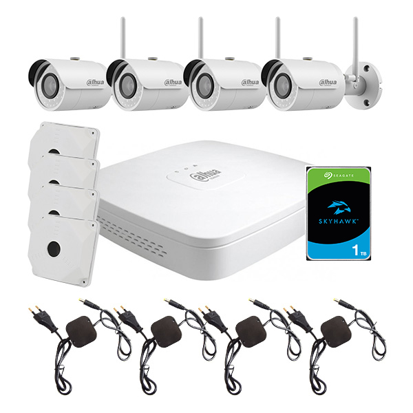 Комплект Wi-Fi відеоспостереження WiFi kit 4cam для будівельних майданчиків включає: 1 IP-відеореєстратор на 4 відеоканали, 1 жорсткий диск на 1 ТБ, 4 вуличні IP-відеокамери з Wi-Fi модулем з роздільною здатністю 1.3 Mpx, 4 блоки живлення DC12V/1.5A, 4 кронштейни для кріплення камер.