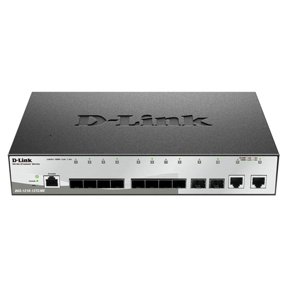 Комутатор DGS-1210-12TS/ME оснащений 10 портами 1000Base-X SFP і 2 портами 10/100/1000Base-T. Захист від статичної електрики 6 кВ. Підтримує Auto Voice VLAN. Протоколи Spanning Tree (STP): 802.1D-2004 edition, 802.1w і 802.1s. Підтримує управління доступом 802.1X на основі порту/вузла. Зручний для користувача Web-інтерфейс. Підтримує функцію захисту від широкомовного шторму. Мережеві кабелі UTP категорії 5, 5e (макс. 100 м). Для встановлення в стандартну 11-дюймову стійку, висота 1U. У комплекті 2 кріпильних кронштейни для встановлення в 19-дюймову стійку.