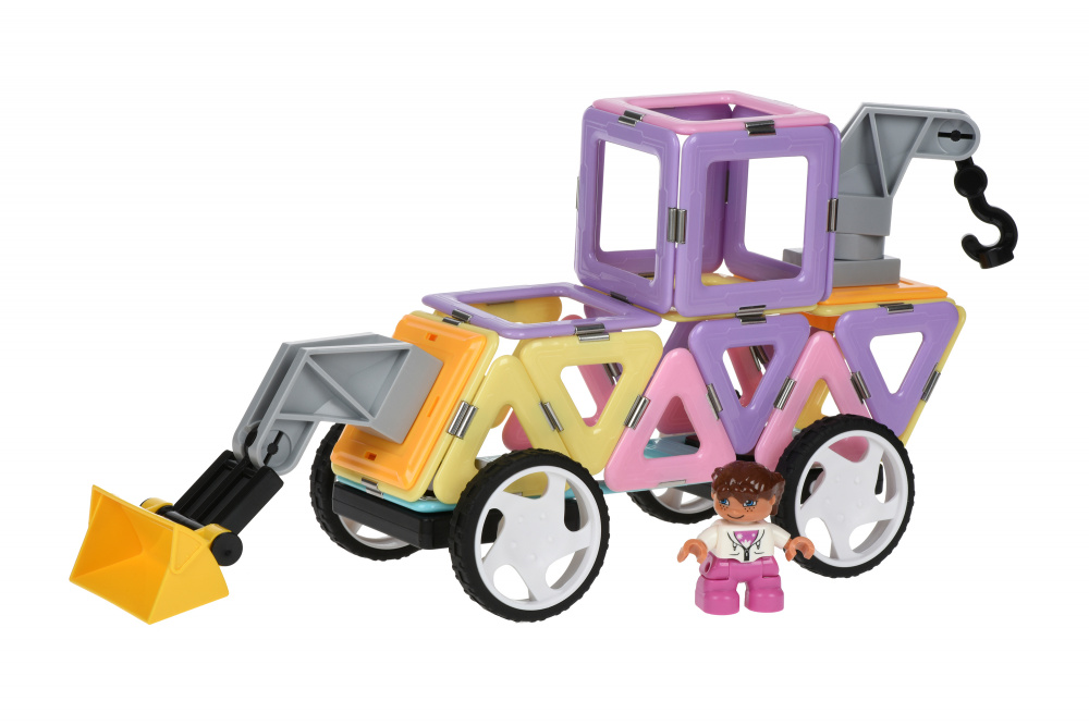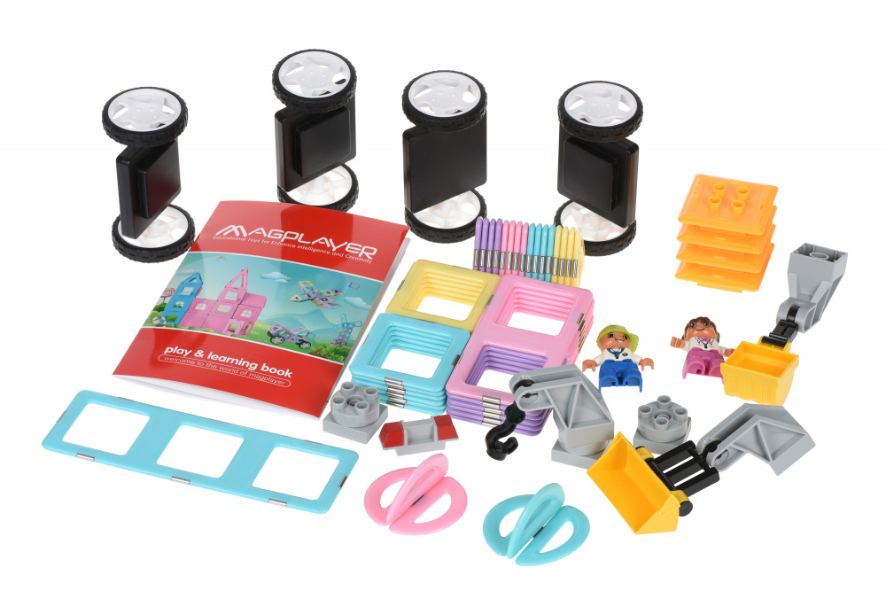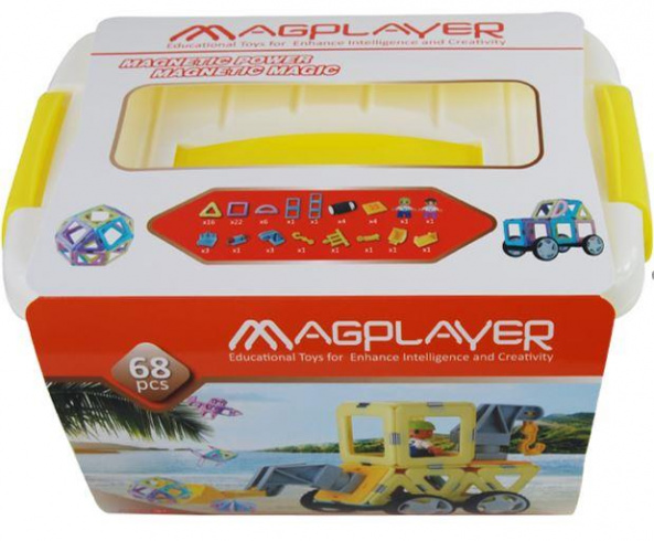 Конструктор Magplayer – набір намагнічених деталей. Особливість конструктора у тому, що для складання не потрібно жодних допоміжних елементів. Усі деталі по периметру мають спеціальні магніти, завдяки яким кріпляться один до одного. Набір із 68 деталей призначений для дітей від 3 років. За допомогою елементів з набору можна сконструювати різноманітні моделі, фігури, наприклад, ракету, автомобіль або екскаватор, як показано на упаковці контейнеру.