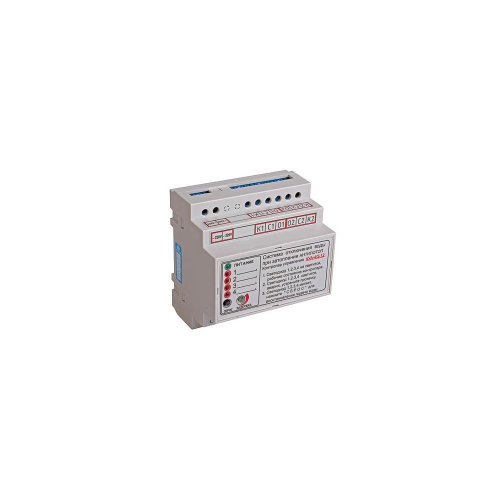 Контролер керування системою АНТИПОТОП, 4 зони затоплення (до 20 датчиків), керує 2 електромагнітними клапанами (NO/NC, 12VDC), звукова і світлова індикація, корпус на DIN-рейку, підключається до мережі 220В/50Гц Контролер керування системою АНТИПОТОП, контролює 4 зони затоплення (до 20 датчиків), керує 2 електромагнітними клапанами (NO/NC, 12VDC), звукова і світлова індикація, корпус на DIN-рейку, підключається до мережі 220В/50Гц.