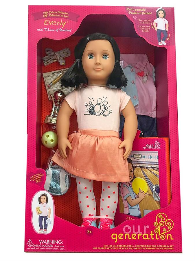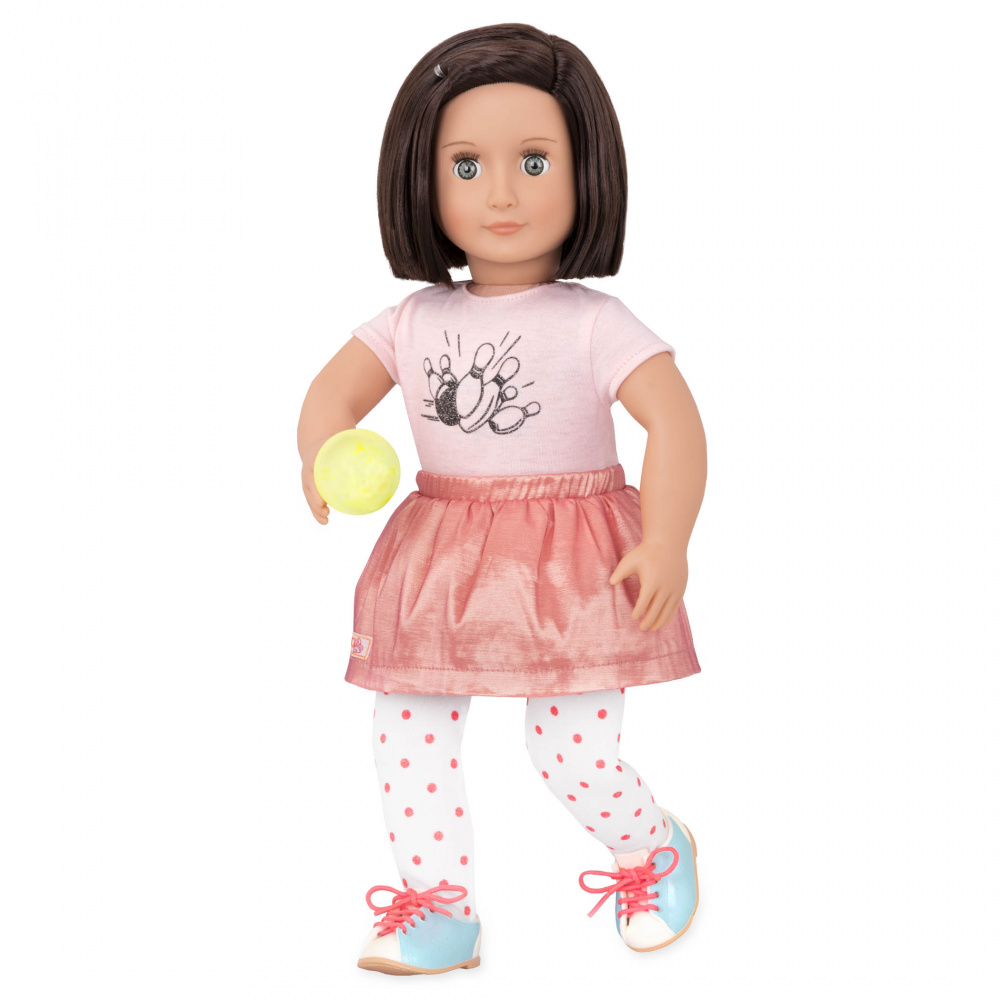 Лялька Еверлі з колекції Delux Dolls від Our Generation - захоплюється боулінгом! Спробуй разом з нею кинути жовту кулю і вибити страйк!