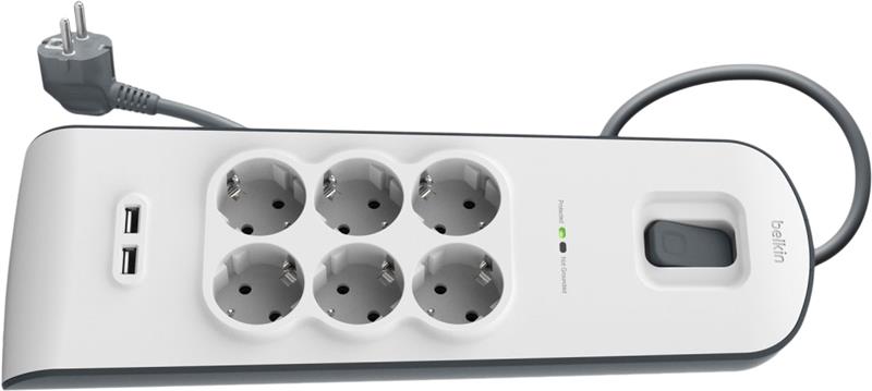 Опис товару Мережевий фільтр Belkin з захистом від перенапруги, 6 роз., 2xUSB 2.4A, 650 Дж, UL 500 В, кабель 2м