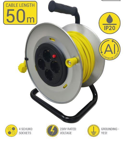 Подовжувач на котушці на 50 м з чотирма розетками євростандарту із заземленням (Schuko), зручною ручкою та захистом ІР20. Ця модель використовує трижильний кабель з перетином 1.5 мм2 (3x1.5mm). Кабель стійкий до неабразивним поверхонь, ультрафіолету, та нафтопродуктів.
