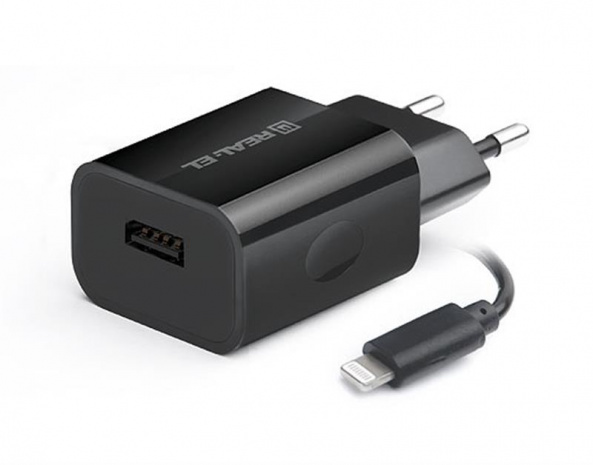 Опис товару Мережевий зарядний пристрій REAL-EL CH-217 (2USB, 2.1A) Black + кабель Lightning