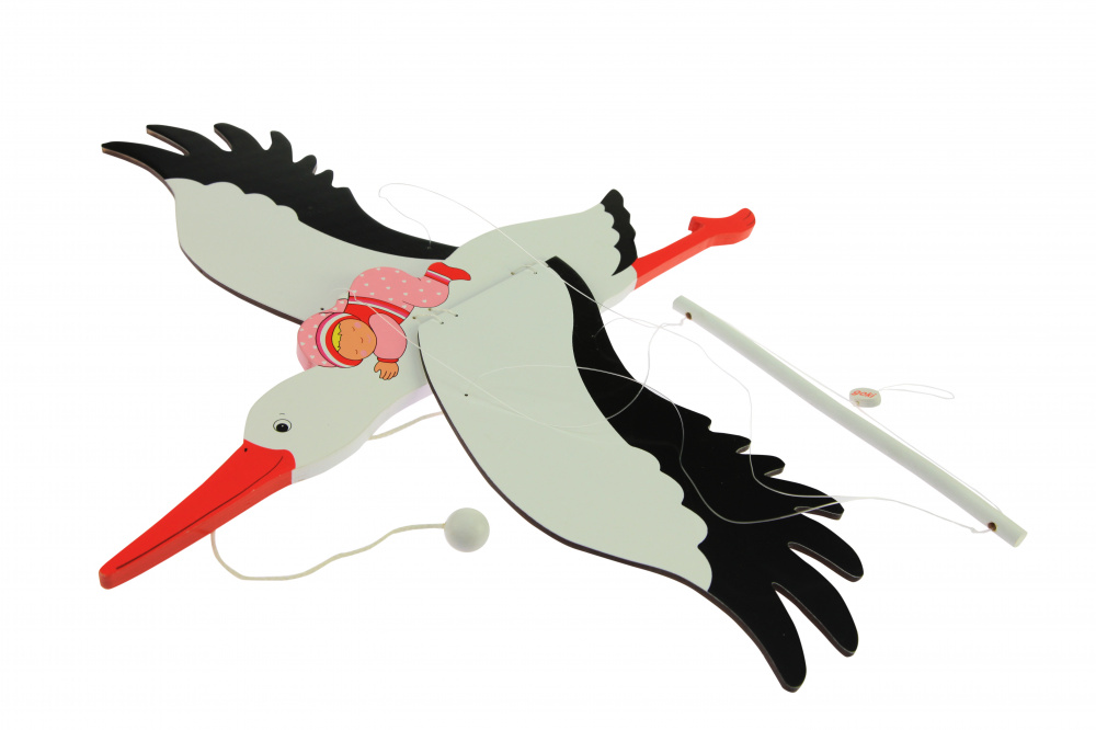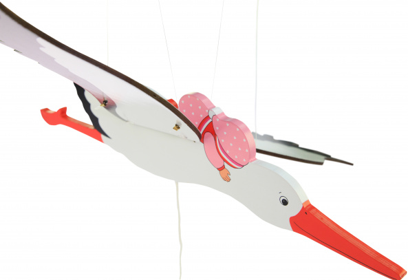 Дерев’яний мобайл «Лелека з дівчинкою» німецького виробника іграшок goki оберігатиме сон малюка та звеселятиме його після пробудження. Мобайл виконаний з сертифікованої деревини та покритий екологічними фарбами, тому аксесуар є безпечним для немовляти. Мобайл «Лелека з дівчинкою» виконаний у монохромних кольорах, тому дитина вже з перших днів життя буде помічати аксесуар та концентрувати на ньому увагу. Довжина розмаху крил лелеки становить 54см. Мобайл приводиться до руху від дотику чи ж легкого вітерця.