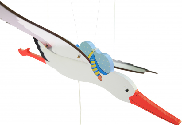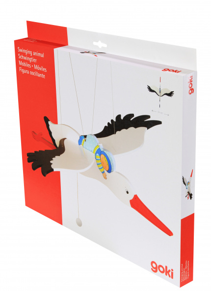Дерев’яний мобайл «Лелека з хлопчиком» німецького виробника іграшок goki оберігатиме сон дитина та звеселятиме її після пробудження. Мобайл виконаний з натуральної деревини та покритий екологічними фарбами, тому аксесуар є безпечним для немовляти. Мобайл «Лелека з хлопчиком» виконаний з монохромних кольорах, тому дитина вже з перших днів життя буде помічати аксесуар. Довжина розмаху крил лелеки становить 54см. Мобайл приводиться до руху від дотику чи ж легкого вітерця.