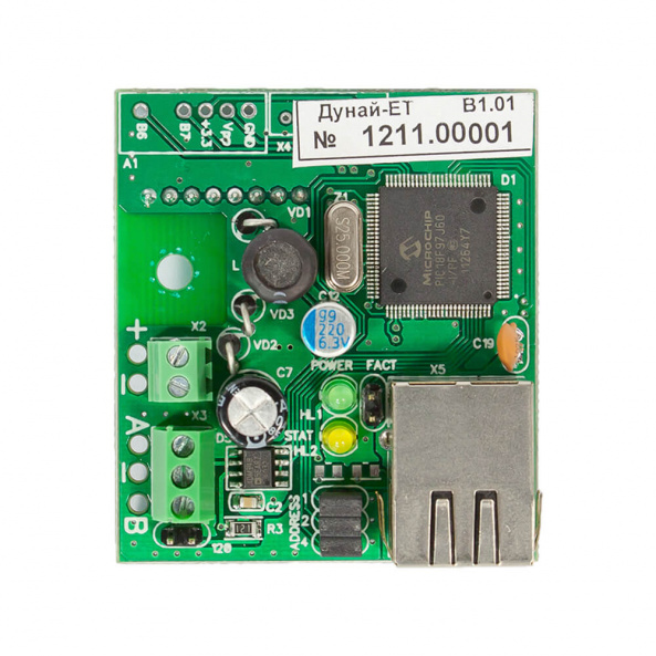 Модуль зв'язку Дунай-ET для ППКОП «Дунай-8(16)/32» призначений для забезпечення функціонування ППК «Дунай» системи охоронно-пожежної сигналізації провідними мережами Інтернет. Прийом та передача повідомлень між ППК та ПЦН здійснюється у форматі UDP. Модуль встановлюється у відповідний роз'єм плати Дунай-СМ. Прийом та передача повідомлень між ППК та ПЦН з використанням Інтернет технологій.