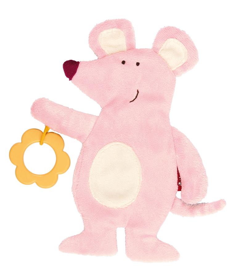 Усміхнена і мила рожева мишка із прорізувачем у вигляді квіточки. Іграшка-обіймашка від німецького виробника sigikid вироблена із м’якого та безпечного поліестеру. Всередині мишки є спеціальна фольга, що шарудить при стисканні, а у ручці вона тримає кільце-прорізувач. Таку іграшку цікаво досліджувати і мацати. Її висота 19 см. Підходить малюкам з народження і особливо стане у нагоді в період прорізування зубів.