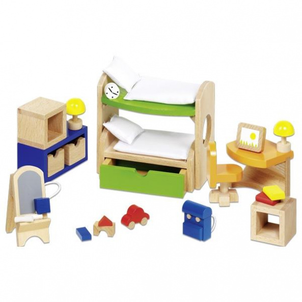 Чудовий набір «Меблі для дитячої кімнати» від німецького виробника іграшок goki вразить дитину різноманіттям деталей. Комплект чудово підійде для усіх будиночків goki, тут є: двоповерхове ліжко із набором постілі, столик, стільчик, полиці, рюкзак, дошка для малювання, годинник, лампи. Відтепер лялькам у їх будиночку буде затишно та цікаво проводити час, відпочивати. Усі деталі вироблені із натурального дерева, вони ідеально відшліфовані, вкриті яскравими фарбами на водній основі. Набір безпечний для здоров’я і призначений дітям від 3-х років.