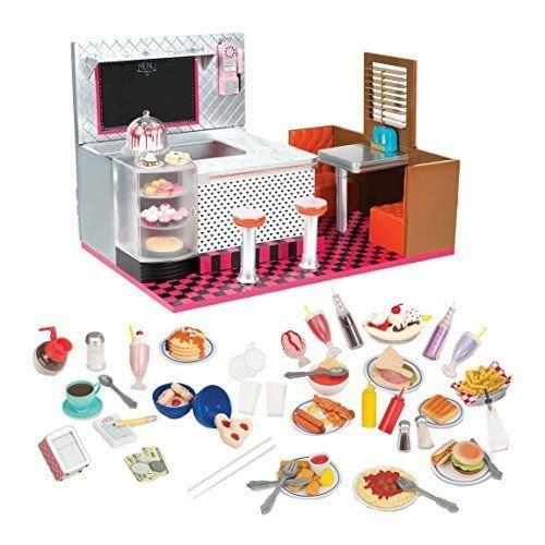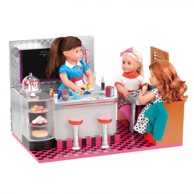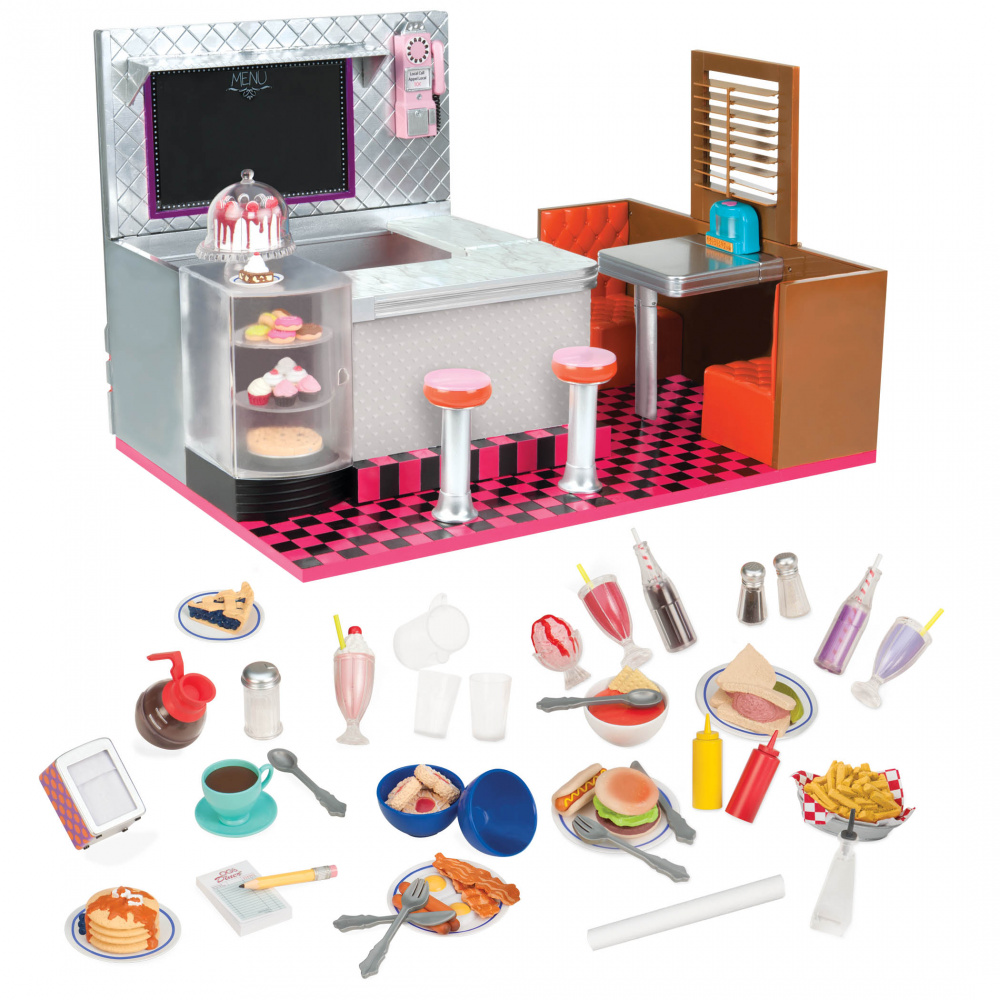 Ретро-їдальня від Our Generation – абсолютний must-have для любителів різноманітних ласощів та смаколиків. Окрім оригінального дизайну та яскравої картатої підлоги, набір вирізняється великою кількістю деталей та елементів (86шт). Тут є все і навіть більше – від ситних страв та напоїв до легких десертів. Також, у комплекті йде посуд та столове приладдя. У ретро-їдальні можна влаштовувати посиденьки з друзями під час обідньої перерви або робочі зустрічі. Усі елементи із набору аксесуарів для відпочинку виготовлені із якісних матеріалів, тож є абсолютно безпечними для малечі. Рекомендований вік: 3+