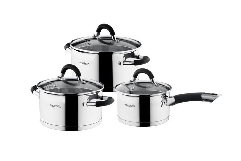 Набір посуду Ardesto Gemini Monza зі зливом, 6 пред., ручки з сірим силіконом, нержавіюча сталь