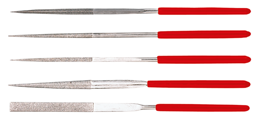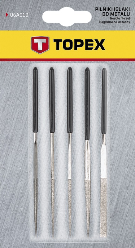 Набір алмазних надфілів TOPEX довжиною 140 мм і діаметром 4 мм. Призначений для вигладжування і шліфування поверхонь, заточування інструментів. Надфілі п'яти універсальних форм забезпечують всебічне застосування. Рукоятка покрита гумою. Алмазне покриття, нанесене гальванічним методом. Бренд TOPEX призначений для домашніх майстрів.