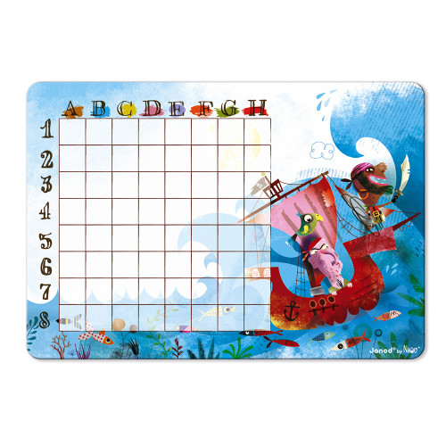 Французький бренд Janod ласкаво запрошує на борт усіх дітлахів! Обдури свого суперника і першим потопи усі його кораблі. «Битва піратів» це захоплююча настільна гра для дітей, більш відома як «Морський бій». Не треба малювати кораблі у зошитах – настільна гра від Janod яскрава, високоякісна та довговічна. Кораблі вироблені у вигляді магнітних елементів, які просто треба розставити на ігровому полі (його розміри 30 х 22 см). Маркером з набору відмічаємо вдалі і не вдалі спроби суперника. Малюнки маркера можна легко стерти з дошки та кораблів. 2 рівня складності дозволять грати як новачкам, так і професіоналам. Рекомендовано для дітей від 5-х років.