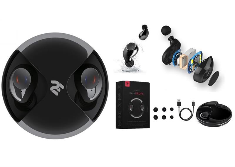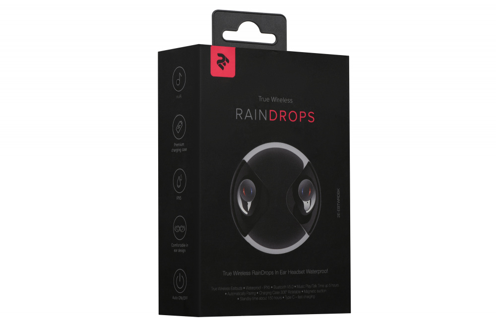 Повністю бездротові навушники з кейсом для підзарядки, мікрофоном та вологозахистом IPX5. Для підключення використовується Bluetooth 5.0, а час автономної роботи навушників становить 5 годин. Кейс здатний повністю зарядити навушники 3 рази, що збільшує загальний час роботи RainDrops до 15 годин. Магнітна фіксація дозволяє легко помістити вкладиші в кейс, а при вилученні відбувається автоматичне з’єднання навушників з пристроєм. 2E RainDrops укомплектовані силіконовими амбушурами трьох розмірів і кабелем USB Type-C для зарядки кейса.