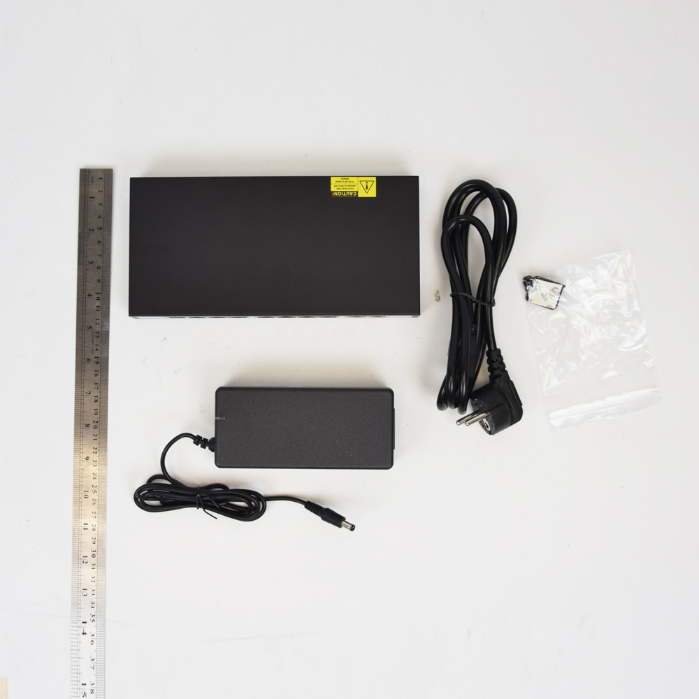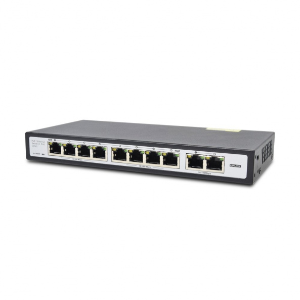 Некерований PoE AF комутатор. 8 портів 10/100 Мбіт/с PoE, 2 порти 10/100 Мбіт/с UPLINK. Напруга PoE на кожному порту: 48В. Максимальна потужність: 90 Вт. Відстань до споживача PoE: до 250м. Розміри: 220 x 105 x 27.5мм
