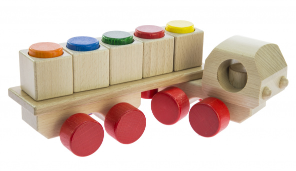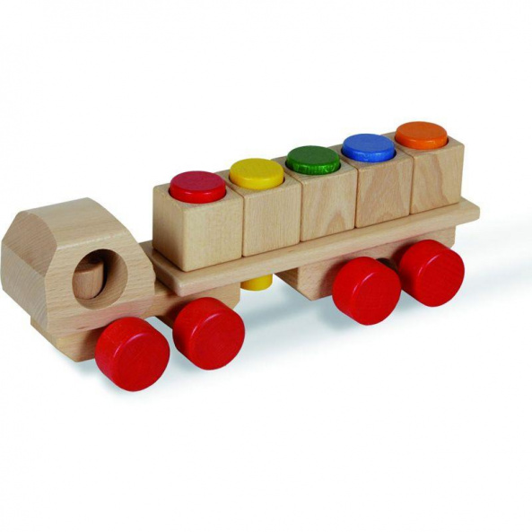 Дерев’яний універсальний автомобіль стане улюбленою іграшкою дітлахів від 1,5 року. Автомобіль постачається у надійній прямокутній упаковці у зібраному вигляді, тому їм одразу можна починати гратись. Його довжина 30,5 см. Матеріал вантажівки – натуральне дерево, деякі частини вкриті кольоровими фарбами на водній основі. Усі елементи приємні на дотик, вони якісно оброблені, а фарби – нетоксичні.
