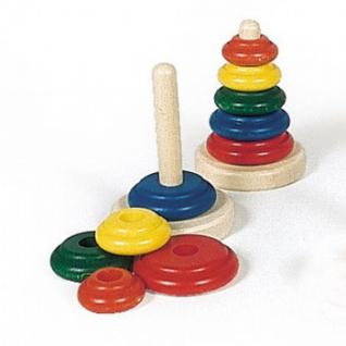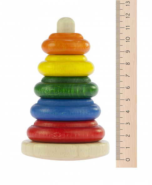 Класична пірамідка – це найпоширеніша іграшка для дітей. Комплект іграшки оформлений у фірмову картонну упаковку. Пірамідка складається із 6 деталей, її висота – 12 см. Усі деталі вироблені із натурального дерева, вони якісно оброблені. Кольорові фарби нетоксичні, весь комплект – безпечний для здоров’я дитини. Така пірамідка рекомендована дітям від 1 року.