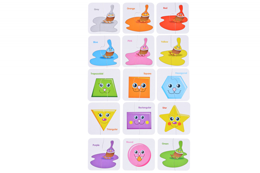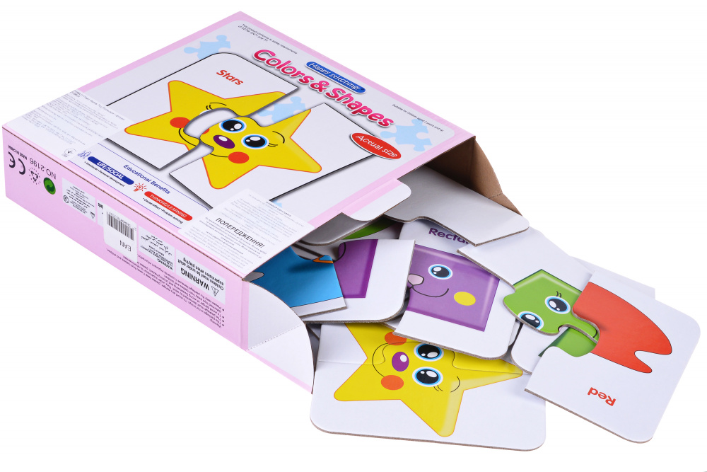 Навчальні пазли «Кольори і фігури» для малюків. У наборі 25 карток з яскравим зображенням. Дитина повинна з'єднати в пари геометричні фігури, відповідно до того, яку форму і колір має кожен предмет. Гра розвиває дрібну моторику рук, сприйняття світу, відмінність квітів і форм, тактильні навички, уяву, логічне мислення, пам'ять і увагу. Фрагменти пазла виготовлені з міцного картону. Рекомендований вік: 3+
