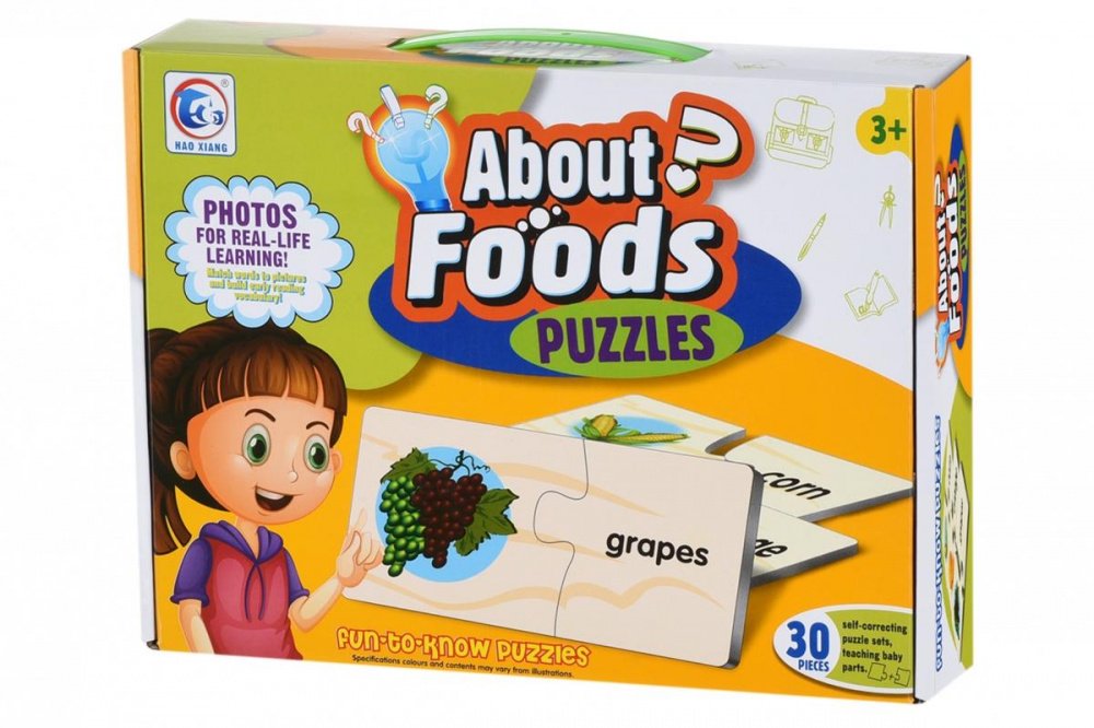 Пазл «Їжа» - набір, з яким діти зможуть цікаво розвиватися, розвинуть важливі навички і вивчать нові слова і явища. У наборі 30 пар пазлів. Всього 60 фрагментів. На 30 фрагментах - зображення, на інших 30 - слова, які їм відповідають. Перед дитиною завдання - правильно поєднати предмети: зображення і слово англійською мовою. Пазли виготовлені з щільного картону, які не ушкодяться під час експлуатації. Зображення нанесено нетоксичними фарбами. Для дітей від 3 років.
